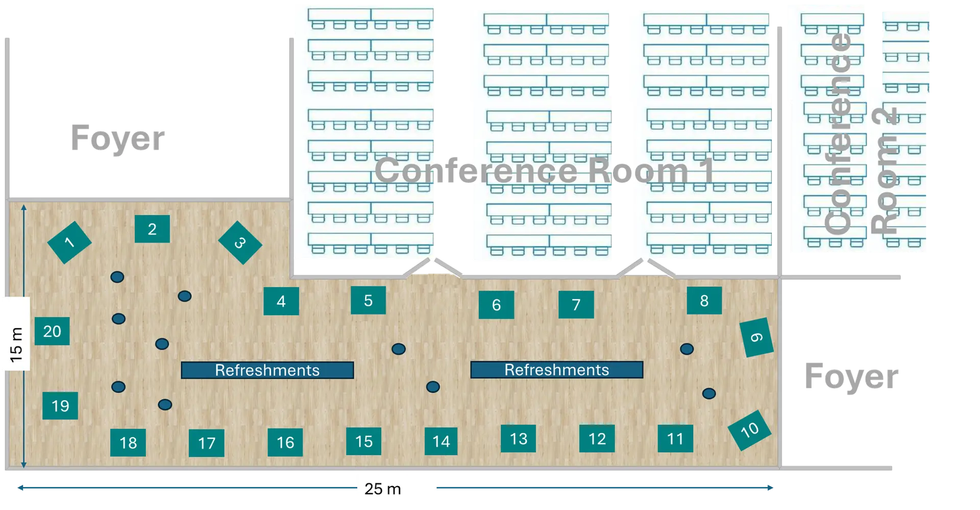 Two long buffet stations to cater for 200+ delegates and high posing tables for 4 people each will be spread out by the stands for maximum networking.